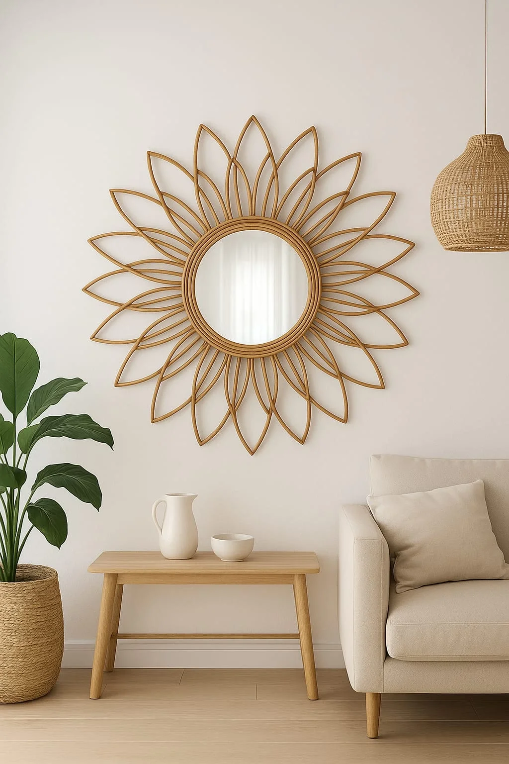 Doğanın sıcaklığını evinize taşıyan bu bambu duvar aynası, sade ama etkileyici tasarımıyla hem dekoratif hem de işlevseldir.