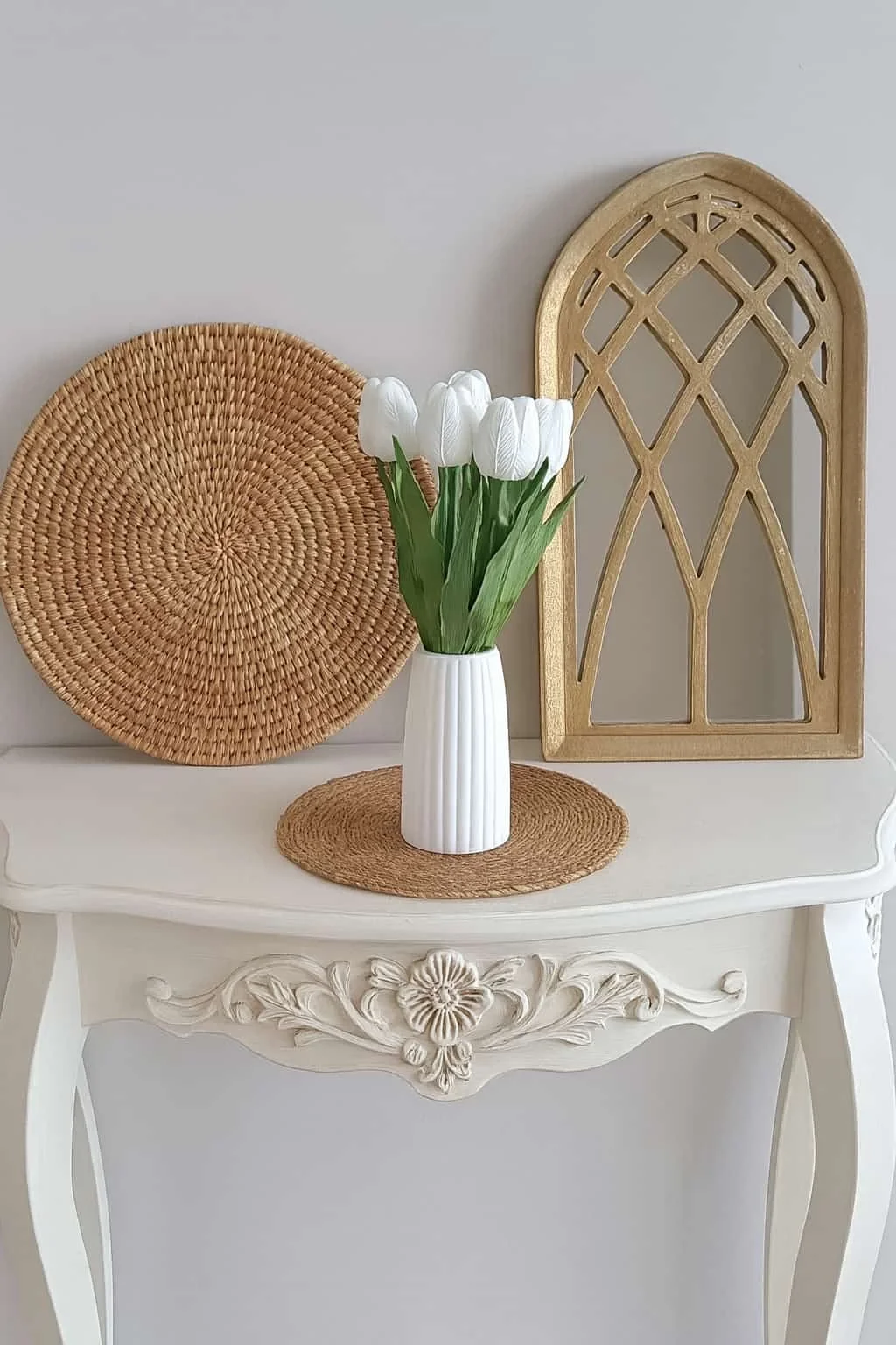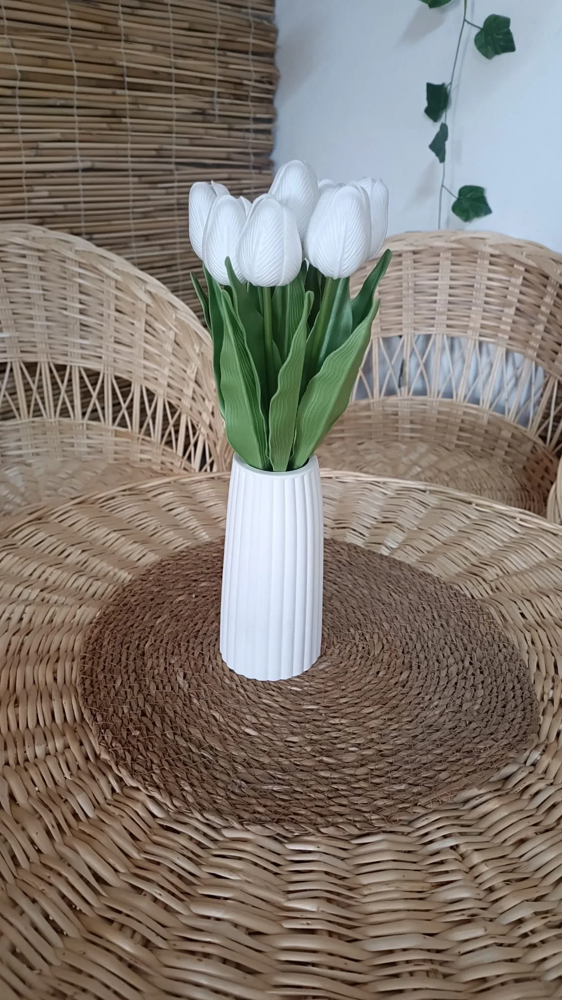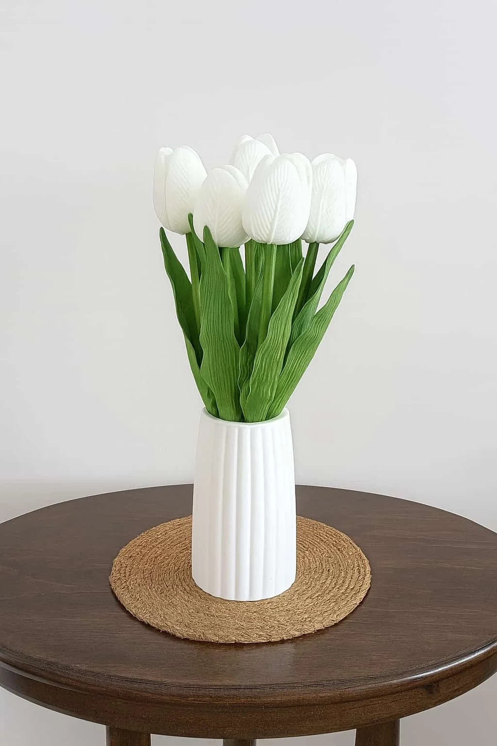 Evinize veya ofisinize baharın enerjisini getiren bu şık aranjman; taş tozundan üretilmiş modern beyaz vazo ve ıslak görünümlü premium yapay beyaz laleler ile uzun ömürlü ve bakımı kolay bir dekoratif çözüm sunar.