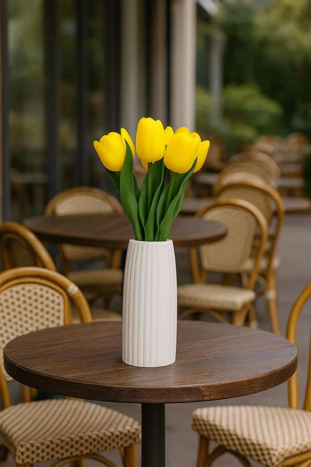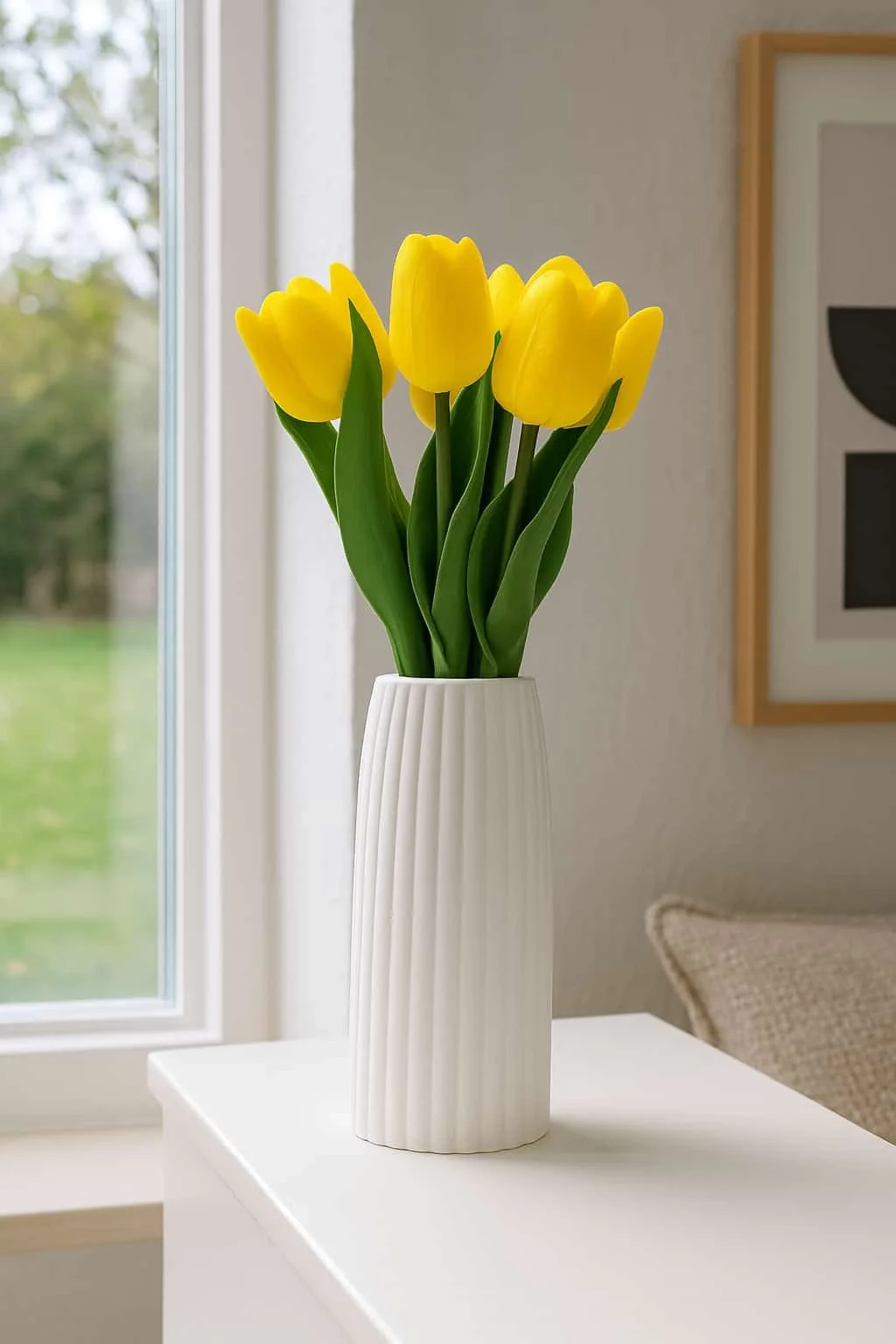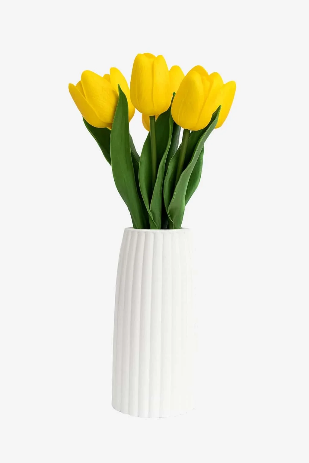 Evinize veya ofisinize baharın enerjisini getiren bu şık aranjman; taş tozundan üretilmiş modern beyaz vazo ve ıslak görünümlü premium yapay sarı laleler ile uzun ömürlü ve bakımı kolay bir dekoratif çözüm sunar.
